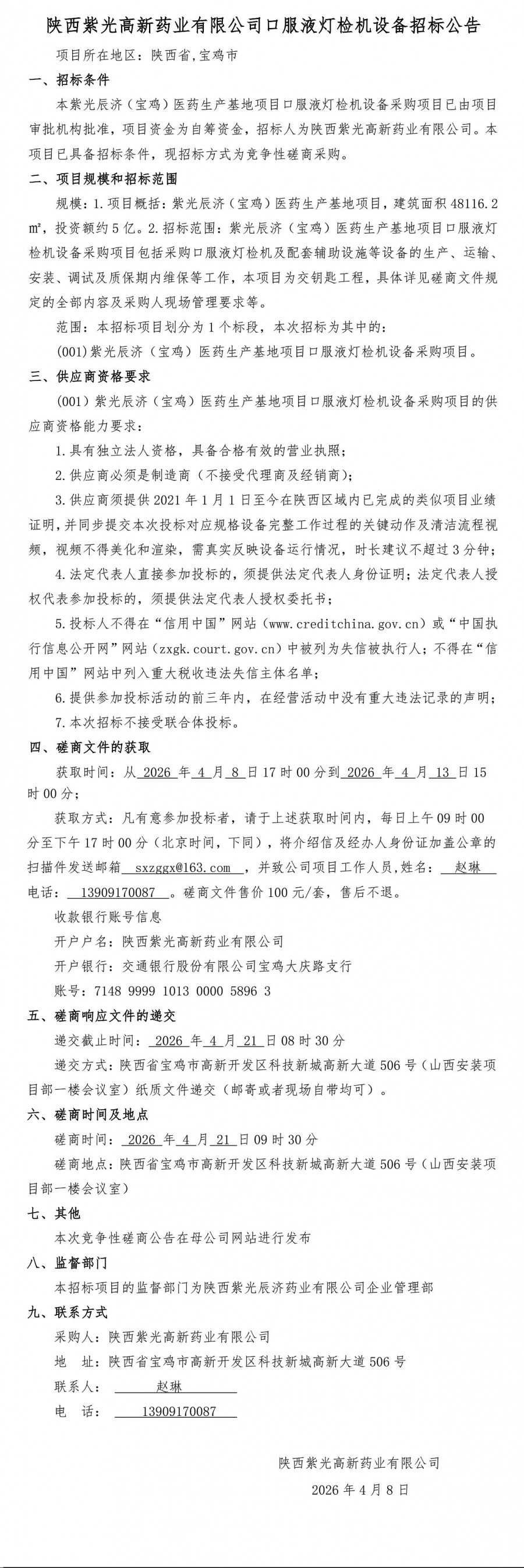陕西紫光高新药业有限公司口服液灯检机设备招标公告